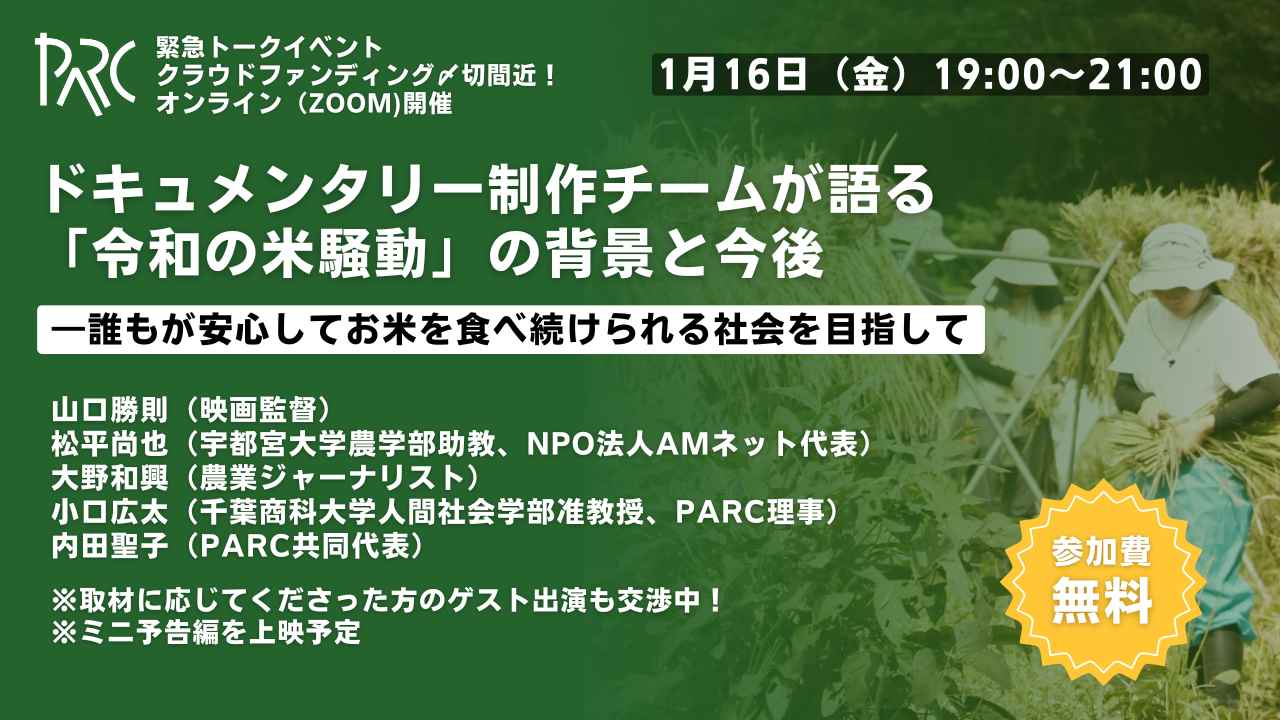 映像制作のクラウドファンディングの締め切り(2月10日)前に、取材の報告やミニ予告映像などを交えながら、皆様と農と食の未来、食の民主主義について考えるトークイベントを開催します。